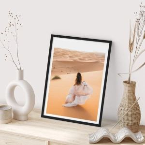 Plakat w czarnej ramie - Kobieta w zwiewnej sukni na pustyni - 50x70cm - Ucieczka do wolności - Nowoczesna dekoracja ścienna do salonu i sypialni ARTTOR
