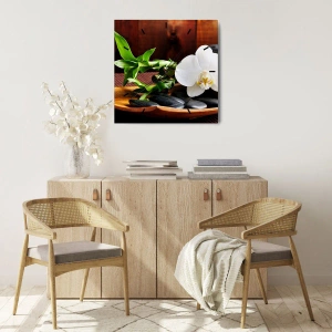 Zegar ścienny - Poddaj się dotykowi natury - Biała orchidea z bambusem i kamieniami