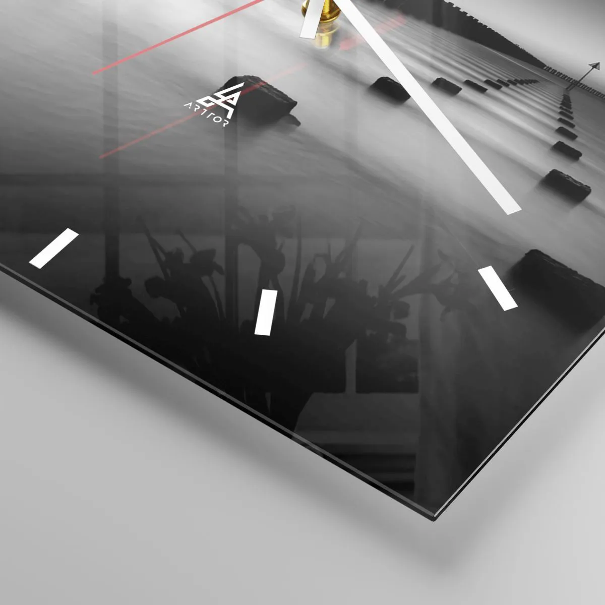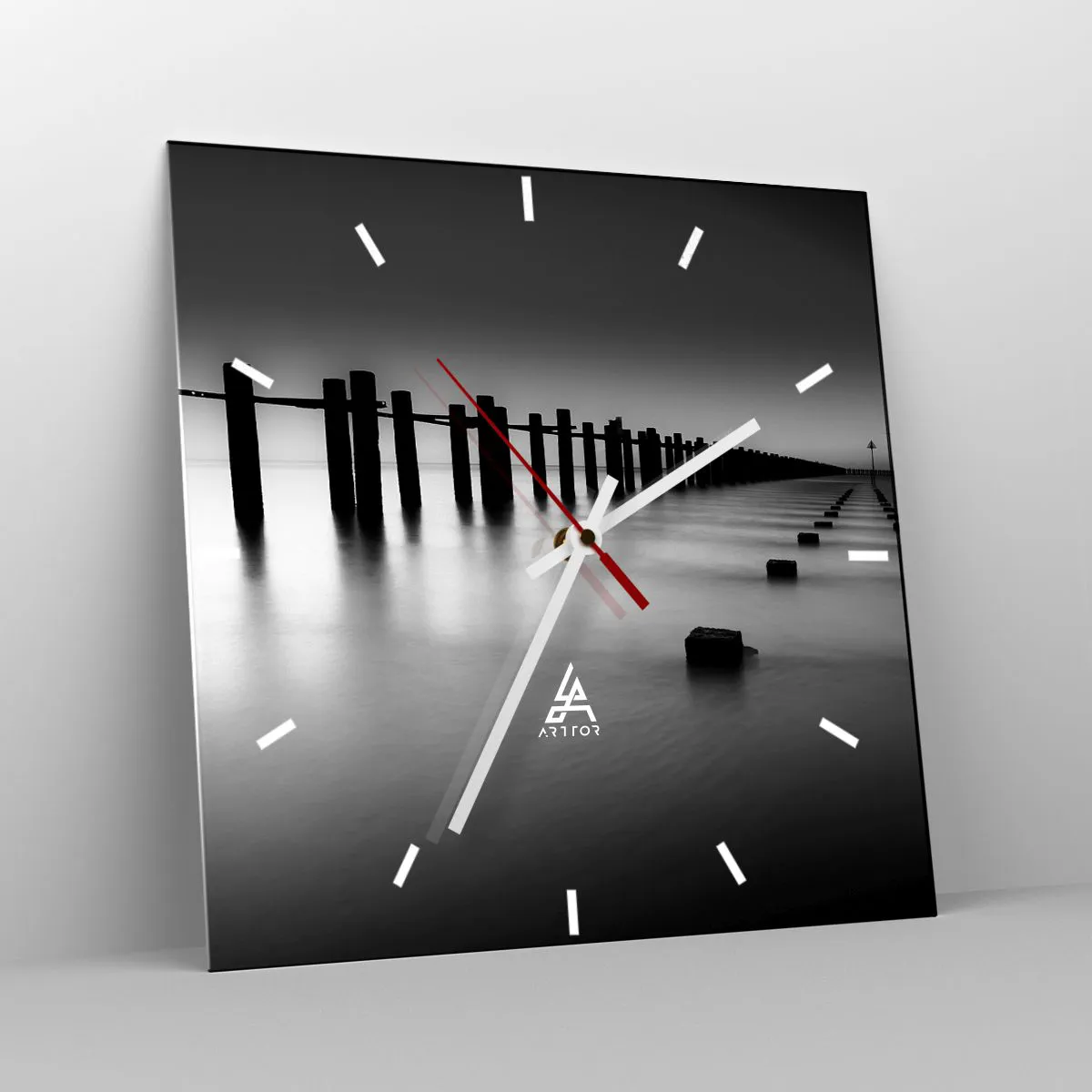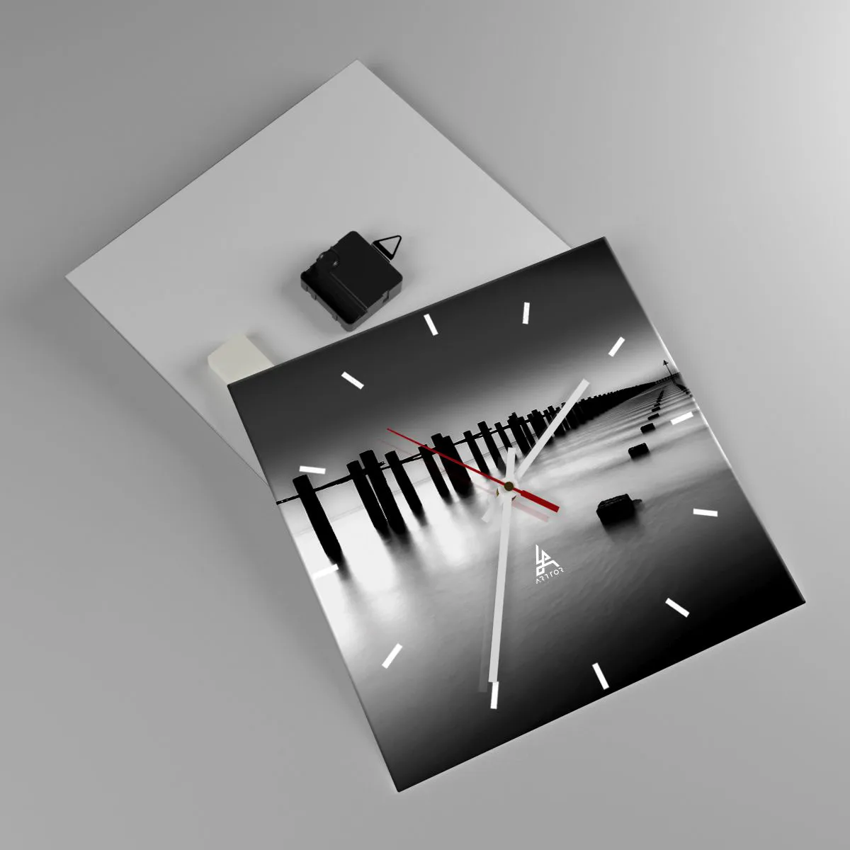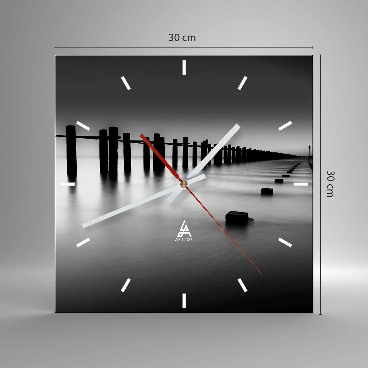 Zegar ścienny - Drewniane pale i betonowe bloki zanurzone w wodzie w czarno-białej tonacji - 30x30cm - Szara dal we mgle - Nowoczesna dekoracja ścienna do salonu i sypialni ARTTOR