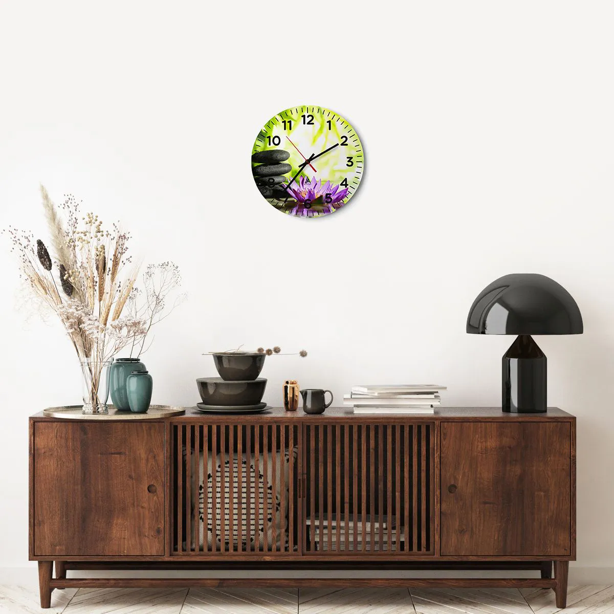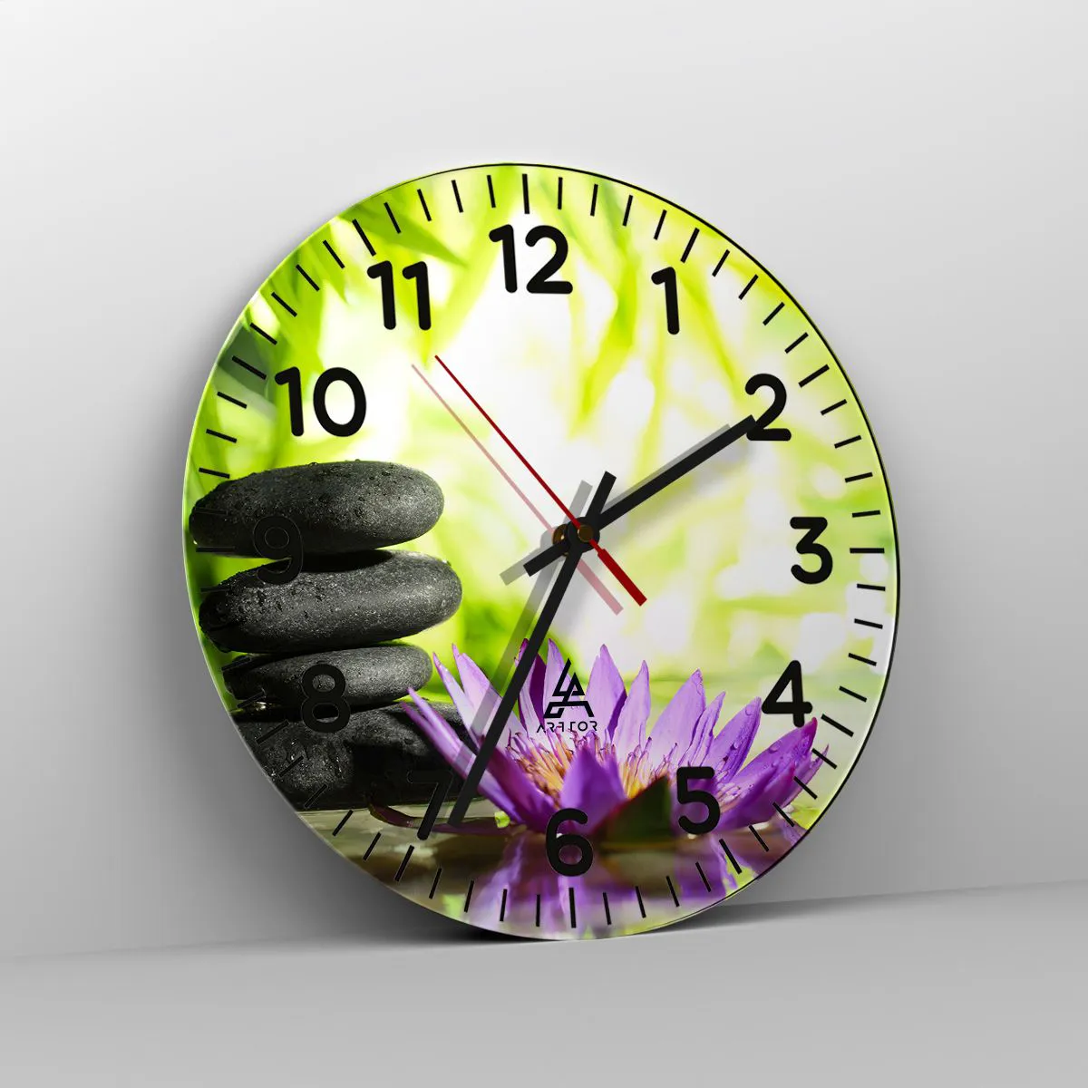 Zegar wykonany jest przy zastosowaniu nowoczesnych technologii druku, które gwarantują zachowanie naturalnych barw jak i wysokie nasycenie kolorów. Produkcja zegarów na szkle odbywa się wieloetapowo. Wysokiej jakości wydruk oraz dwie warstwy zabezpieczające poddawane są procesowi termicznego połączenia ze szkłem. Wykorzystujemy w tym celu innowacyjną technologię pieców do laminacji szkła w środowisku próżni.