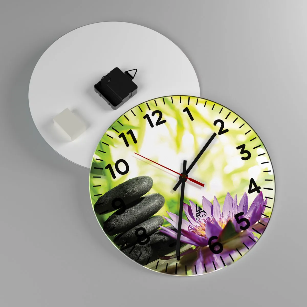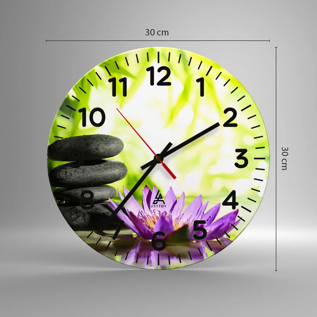 Zegar wykonany jest z bezpiecznego szkła o grubości 4mm. Technologia wykonania zegara jest zgodna z klasą bezpieczeństwa 2B2 według normy PN-EN 12600:2004, która gwarantuje wytrzymałość na uderzenia. Zegar na szkle jest gotowy do powieszenia – posiada metalową zawieszkę zamocowaną z tyłu zegara oraz piankowy dystans regulujący równomierny odstęp zegara od ściany. Zegar posiada cichy mechanizm płynący zasilany baterią 1,5V - bateria AA (bateria nie jest umieszczana w zestawie).