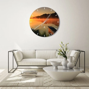 Zegar ścienny - Poranna mgła nad rzeką z łódką w promieniach słońca - 30x30cm - Wschód słońca nad wodą jak tafla lustra - Nowoczesna dekoracja ścienna do salonu i sypialni ARTTOR