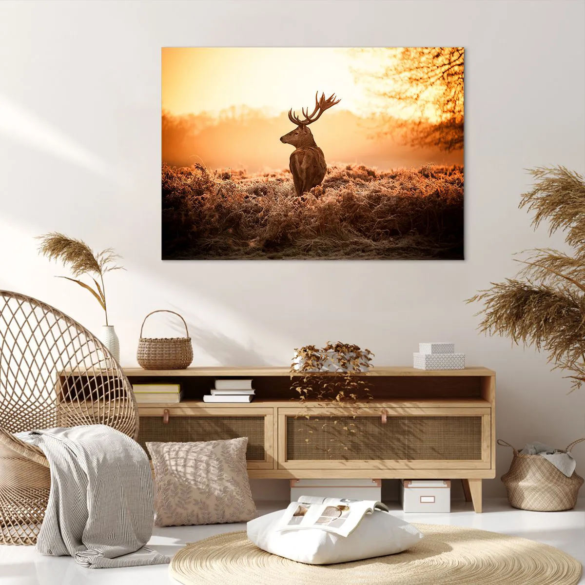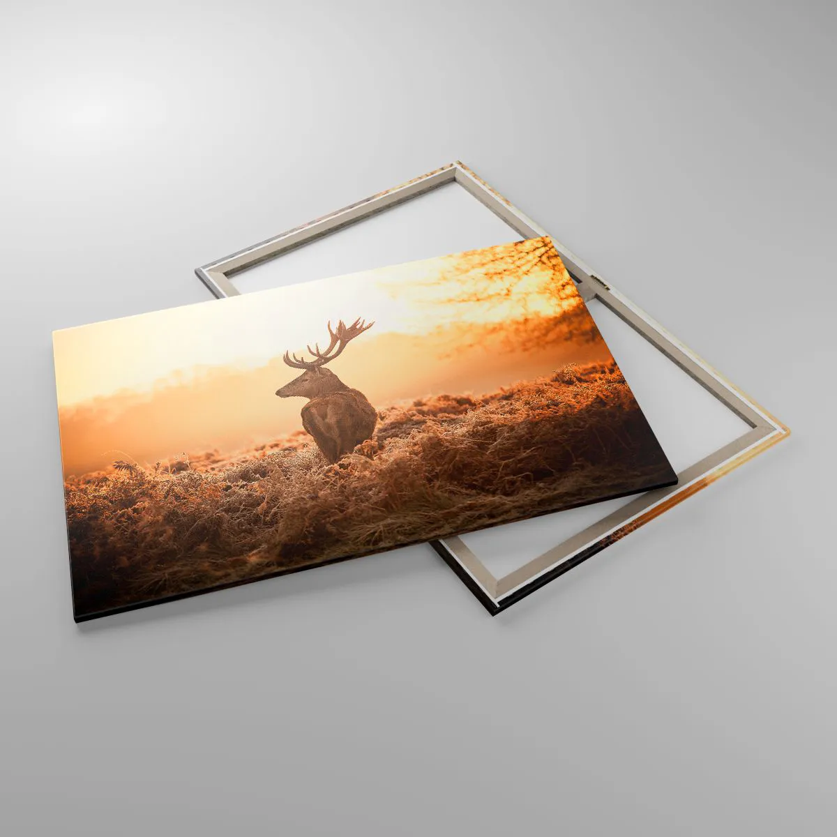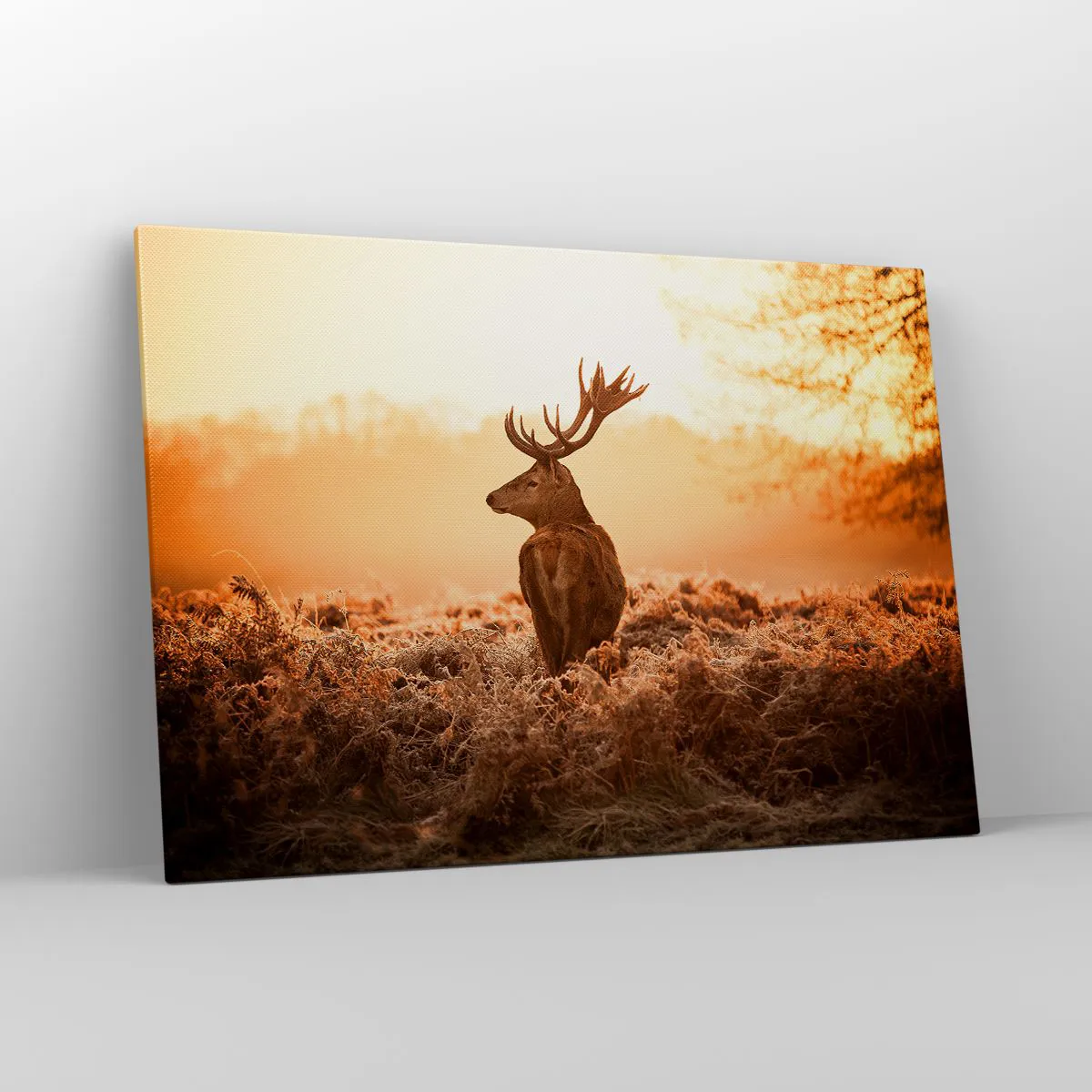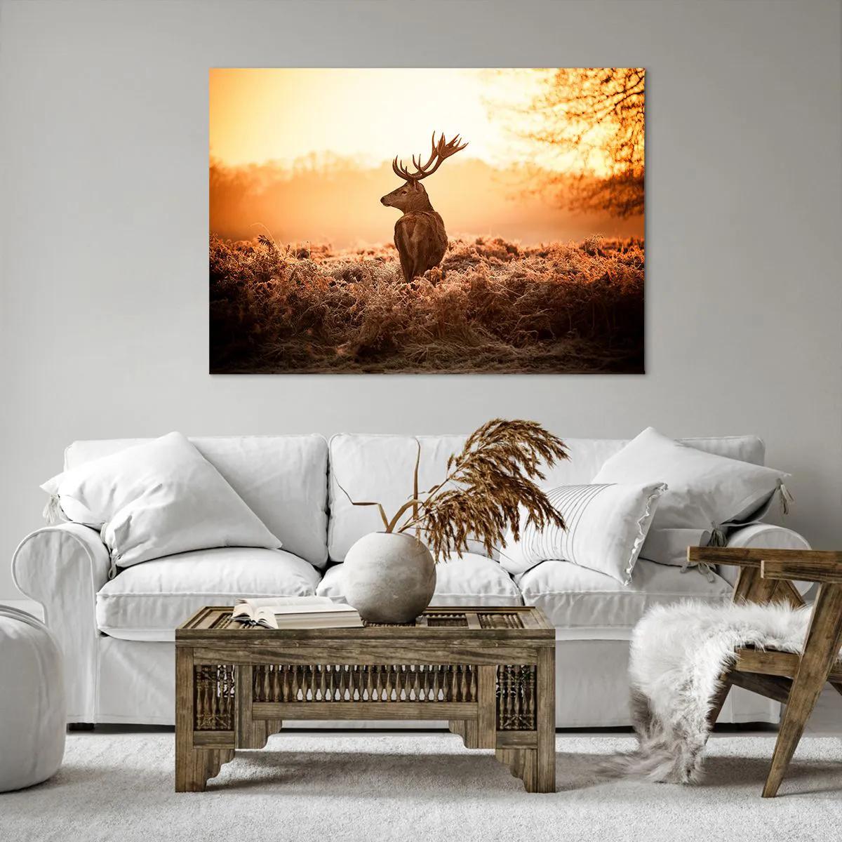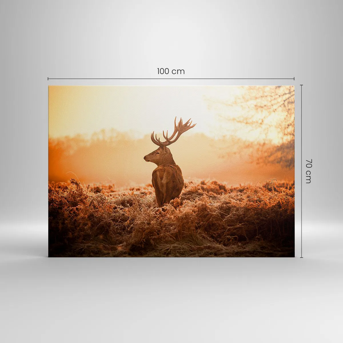 Obraz na płótnie - Jeleń w promieniach wschodzącego słońca - 100x70cm - Pan na włościach - Nowoczesna dekoracja ścienna do salonu, kuchni i sypialni ARTTOR