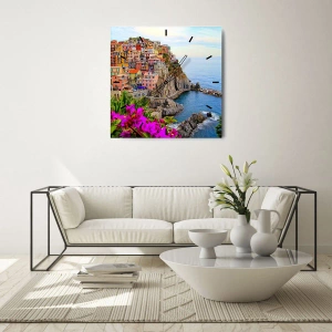 Zegar ścienny - Kolorowe domy na klifie nad brzegiem morza w malowniczym krajobrazie - 30x30cm - Śmiejące się miasto - Nowoczesna dekoracja ścienna do salonu i sypialni ARTTOR