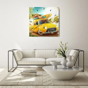 Zegar ścienny - Żółty samochód z bagażami na tle tropikalnego krajobrazu - 30x30cm - Podróż po niejeden uśmiech - Nowoczesna dekoracja ścienna do salonu i sypialni ARTTOR