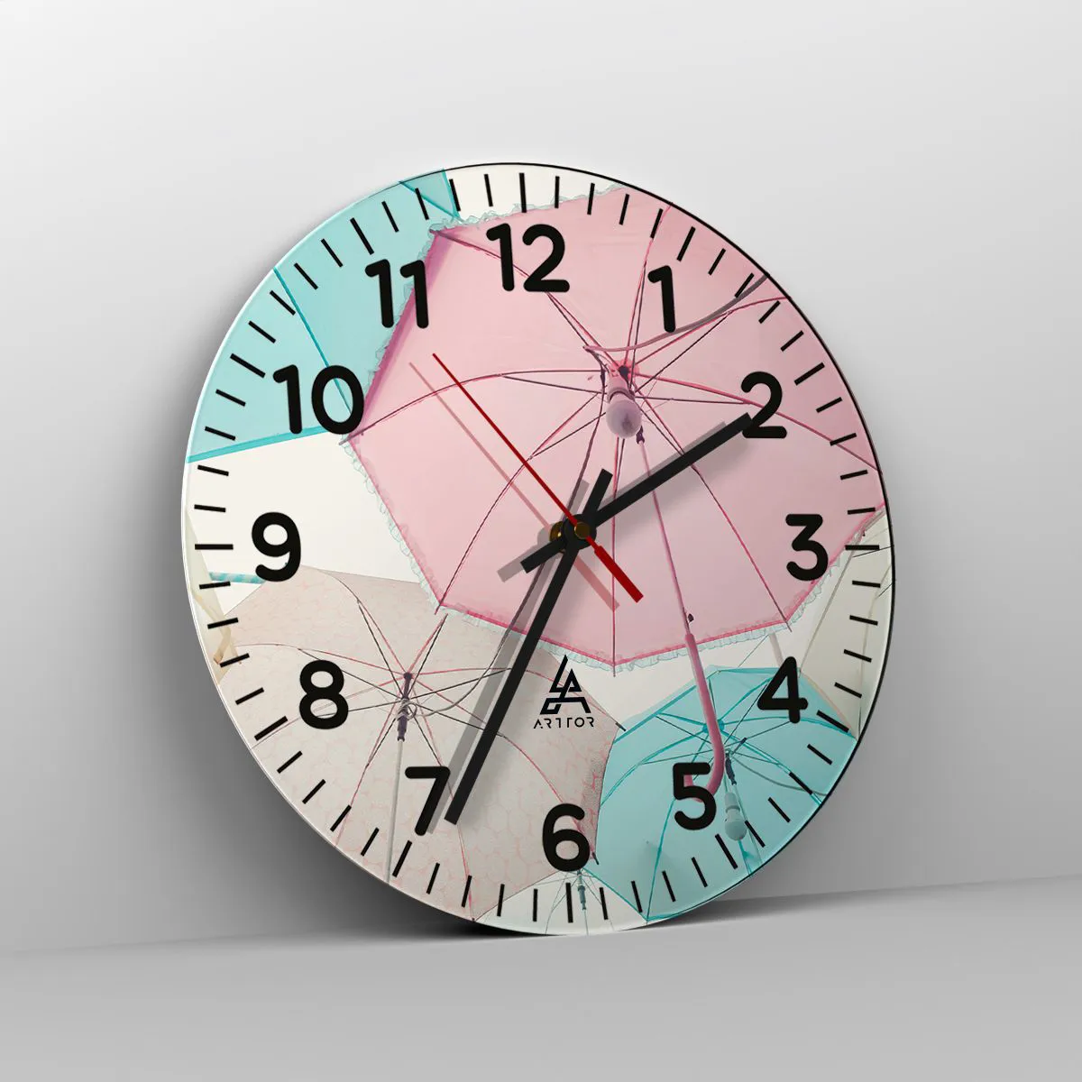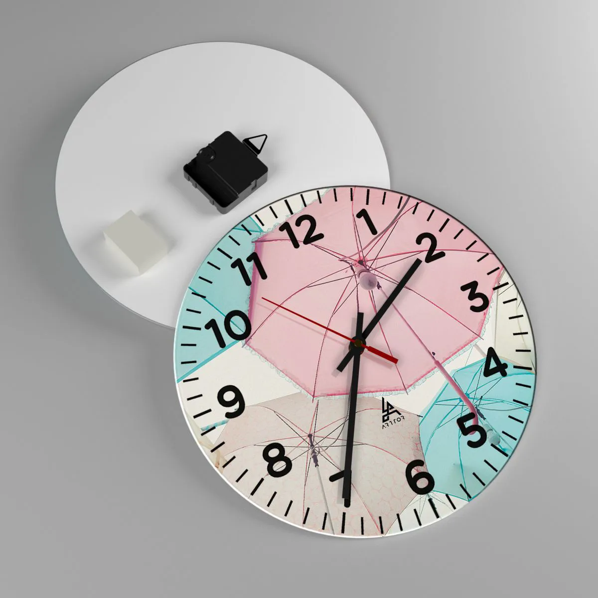 Zegar wykonany jest z bezpiecznego szkła o grubości 4mm. Technologia wykonania zegara jest zgodna z klasą bezpieczeństwa 2B2 według normy PN-EN 12600:2004, która gwarantuje wytrzymałość na uderzenia. Zegar na szkle jest gotowy do powieszenia – posiada metalową zawieszkę zamocowaną z tyłu zegara oraz piankowy dystans regulujący równomierny odstęp zegara od ściany. Zegar posiada cichy mechanizm płynący zasilany baterią 1,5V - bateria AA (bateria nie jest umieszczana w zestawie).