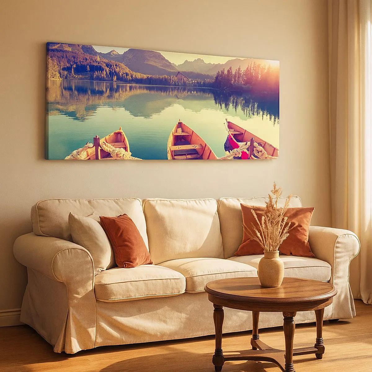 Obraz na płótnie - Łódki na spokojnym jeziorze otoczonym górami o zachodzie słońca - 140x50cm - Żyć według jej praw - Nowoczesna dekoracja ścienna do salonu i sypialni ARTTOR