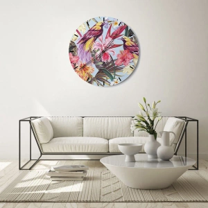Zegar ścienny - Egzotyczne ptaki wśród tropikalnych kwiatów - 30x30cm - Płatki i piórka - Nowoczesna dekoracja ścienna do salonu i sypialni ARTTOR