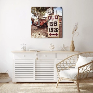 Zegar ścienny - Zabytkowy samochód na tle znaku drogi Route 66 i drewnianej tablicy - 30x30cm - Legenda amerykanskiej prowincji - Nowoczesna dekoracja ścienna do salonu, kuchni i sypialni ARTTOR