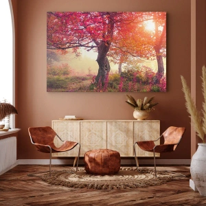 - Obraz przedstawiający malowniczy jesienny krajobraz z intensywnymi kolorami liści, idealny dla wnętrz ceniących piękno natury i harmonię.