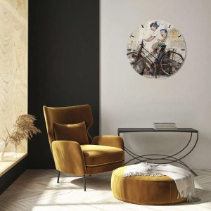 - Zegar ścienny z motywem malowidła dzieci na rowerze na tle muru. Idealny dodatek do wnętrz z charakterem, wprowadzający klimat retro i unikalności.