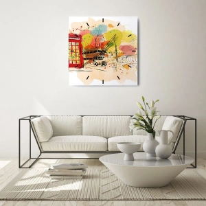 Zegar ścienny - Londyński motyw z czerwonym autobusem i budką - 30x30cm - Miasto rozmaitości - Nowoczesna dekoracja ścienna do salonu i sypialni ARTTOR
