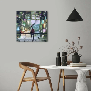 "Dwa światy" to wyjątkowy zegar ścienny, który przenosi w futurystyczny świat pełen neonowych świateł i technologicznego uroku. Motyw przedstawia postać stojącą na tle nowoczesnego miasta z intensywnymi neonami, kontrastującymi z klasyczną panoramą budynków w tle. Ta intrygująca kompozycja łączy dwa światy, tworząc unikalną dekorację.