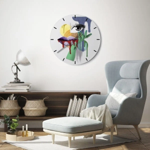 • Zegar z ekspresyjnym motywem abstrakcyjnym przedstawiającym oko, usta i kolorowe elementy. Unikalny design nadaje wnętrzu artystycznego i nowoczesnego charakteru.