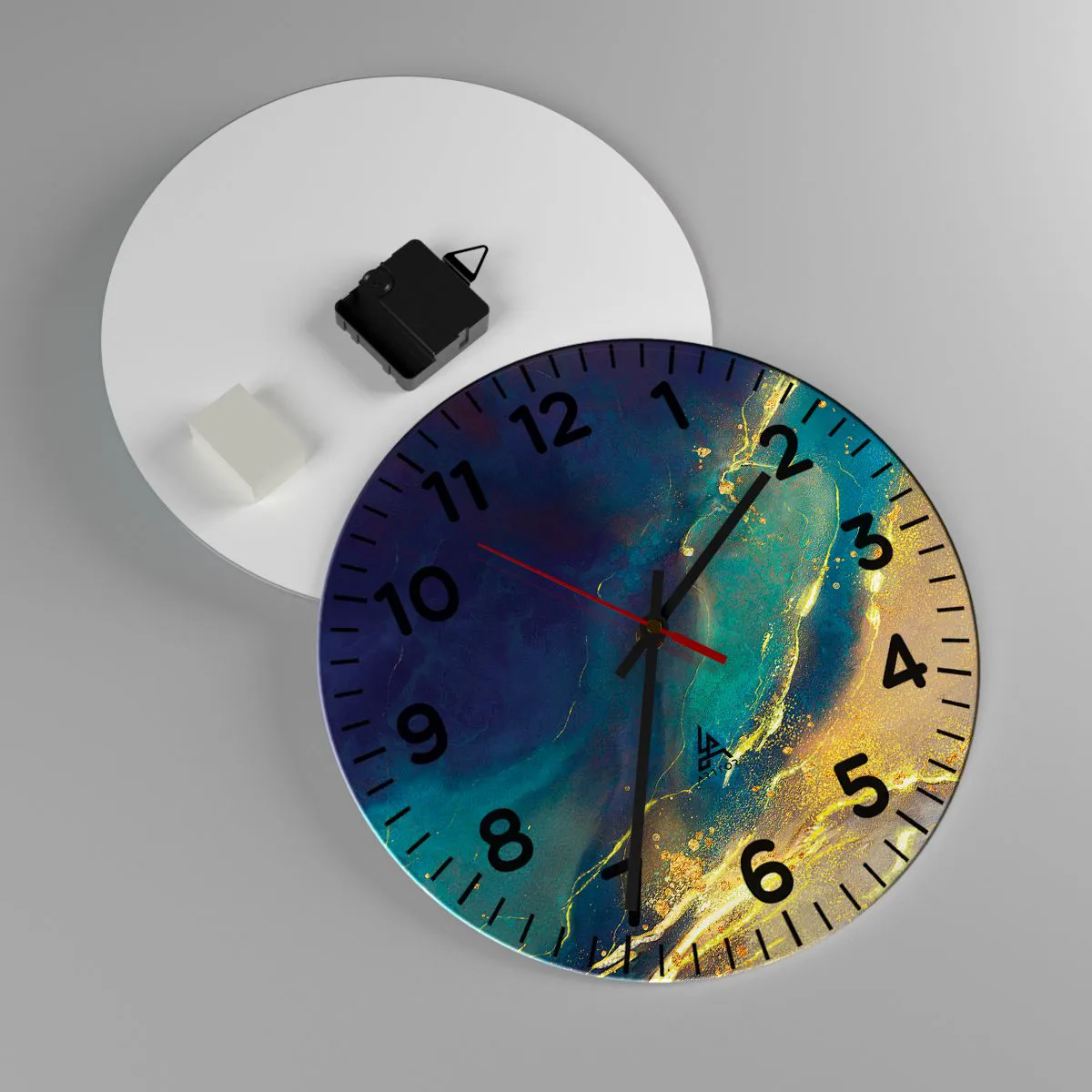 Zegar wykonany jest z bezpiecznego szkła o grubości 4mm. Technologia wykonania zegara jest zgodna z klasą bezpieczeństwa 2B2 według normy PN-EN 12600:2004, która gwarantuje wytrzymałość na uderzenia. Zegar na szkle jest gotowy do powieszenia – posiada metalową zawieszkę zamocowaną z tyłu zegara oraz piankowy dystans regulujący równomierny odstęp zegara od ściany. Zegar posiada cichy mechanizm płynący zasilany baterią 1,5V - bateria AA (bateria nie jest umieszczana w zestawie).