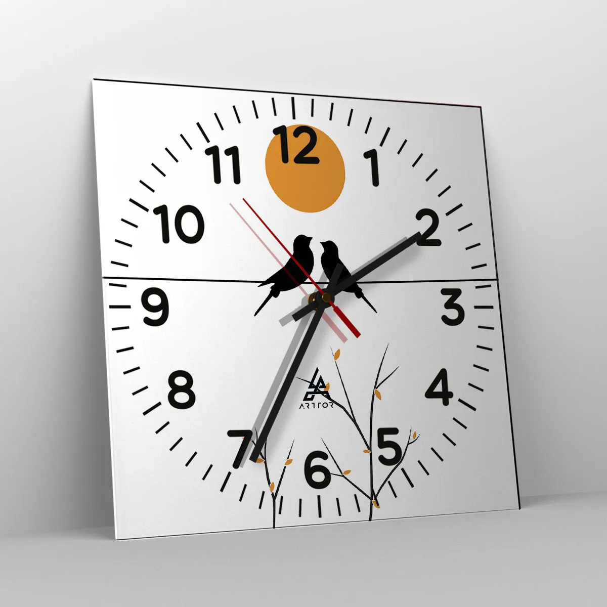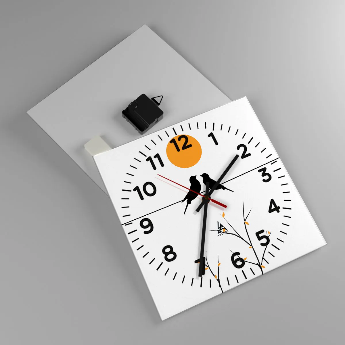 Zegar wykonany jest z bezpiecznego szkła o grubości 4mm. Technologia wykonania zegara jest zgodna z klasą bezpieczeństwa 2B2 według normy PN-EN 12600:2004, która gwarantuje wytrzymałość na uderzenia. Zegar na szkle jest gotowy do powieszenia – posiada metalową zawieszkę zamocowaną z tyłu zegara oraz piankowy dystans regulujący równomierny odstęp zegara od ściany. Zegar posiada cichy mechanizm płynący zasilany baterią 1,5V - bateria AA (bateria nie jest umieszczana w zestawie).