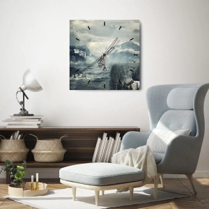 Zegar ścienny - Malowniczy krajobraz z górami, zamkiem i żaglówką na wzburzonym morzu - 30x30cm - Na magicznych wodach - Nowoczesna dekoracja ścienna do salonu, kuchni i sypialni ARTTOR