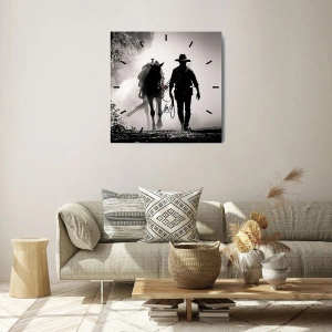 Zegar ścienny "Teksański poranek" to obraz przywołujący ducha Dzikiego Zachodu i westernowej tradycji. W centrum kompozycji znajduje się Kowboj kroczący pewnym krokiem z Końiem u boku, zanurzony w delikatnej Mgłaie poranka. Sylwetki postaci wyróżniają się dzięki kontrastowi czerni i bieli, co wzmacnia ich wyrazistość.