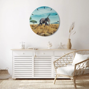 Zegar na szkle wykonany przez ARTTOR ma średnicę 30x30 cm. Szklana powierzchnia dodaje elegancji i podbija nasycenie kolorów. Dzięki wysokiej jakości nadrukowi każdy detal – od faktury traw po pasy na ciele słonia – prezentuje się wyraziście i trwałe.