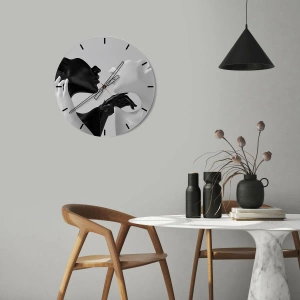 Zegar ścienny "Przyciąganie – pożądanie" ukazuje niezwykle ekspresyjną kompozycję inspirowaną emocjami i fizycznym napięciem. Czarno-biała para twarzy zbliżających się ku sobie oraz splecione dłonie tworzą wizualną metaforę magnetycznego pożądania. Minimalistyczna kolorystyka w odcieniach bieli i głębokiej czerni nadaje kompozycji dramatyzmu i nowoczesności, tworząc silny kontrast zarówno wizualny, jak i emocjonalny.