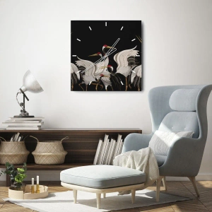 Zegar ścienny - Białe żurawie z czerwonymi akcentami na czarnym tle - 30x30cm - Ptasie sprawy - Nowoczesna dekoracja ścienna do salonu i sypialni ARTTOR