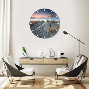 - Zegar ścienny z motywem wejścia na plażę prowadzącego do spokojnego morza o zachodzie słońca. Idealna dekoracja do wnętrz w stylu boho, nadmorskim lub nowoczesnym, wprowadzająca atmosferę wakacyjnego relaksu.