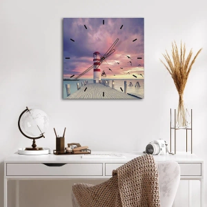 Zegar ścienny - Latarnia morska na molo w otoczeniu malowniczego zachodu słońca - 30x30cm - Pora do portu - Nowoczesna dekoracja ścienna do salonu i sypialni ARTTOR