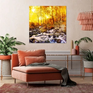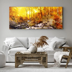 - Obraz przedstawiający jesienny las z potokiem otoczonym złotymi liśćmi. Malownicza i harmonijna kompozycja, która wprowadza spokój i urok natury do wnętrza.