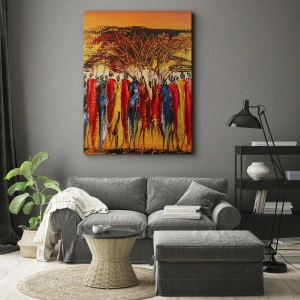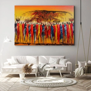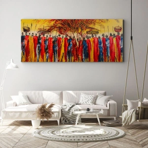 Obraz na płótnie - Kolorowa scena z afrykańskimi postaciami na tle zachodzącego słońca - 140x50cm - Tam, tam, tam tam idą - Nowoczesna dekoracja ścienna do salonu i sypialni ARTTOR