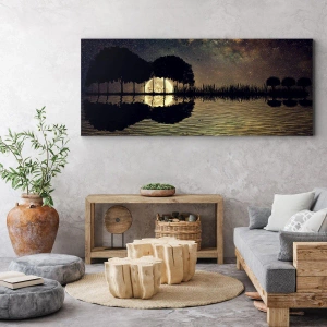 - Obraz przedstawia magiczną noc z drzewami otaczającymi księżyc, którego odbicie widoczne jest na spokojnej wodzie. Tajemniczość i subtelność kompozycji idealnie pasują do wnętrz o wyrafinowanym i eleganckim charakterze.