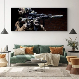 Obraz na płótnie - Żołnierz w pełnym ekwipunku z karabinem - 120x80cm - Zabójczo skuteczny - Nowoczesna dekoracja ścienna do salonu, kuchni i sypialni ARTTOR