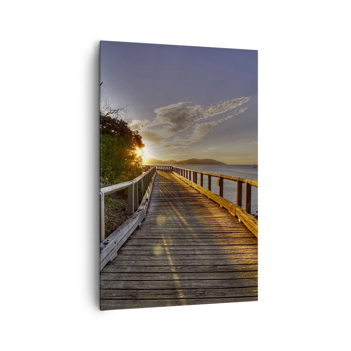 Obraz na płótnie - Drewniany pomost prowadzący w stronę zachodu słońca nad wodą - 80x120cm - Iść, ciągle iść w stronę słońca - Nowoczesna dekoracja ścienna do salonu i sypialni ARTTOR