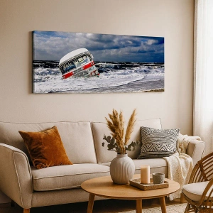 Obraz na płótnie - Zatopiony autobus na plaży wśród fal i wzburzonego morza - 80x120cm - I co się dziwisz? - Nowoczesna dekoracja ścienna do salonu i sypialni ARTTOR