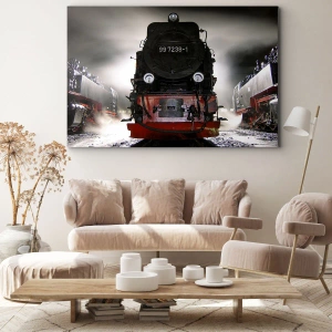 Obraz na płótnie - Czoło starej lokomotywy na wprost - 50x70cm - Stoi i sapie, dyszy i dmucha - Nowoczesna dekoracja ścienna do salonu, kuchni i sypialni ARTTOR