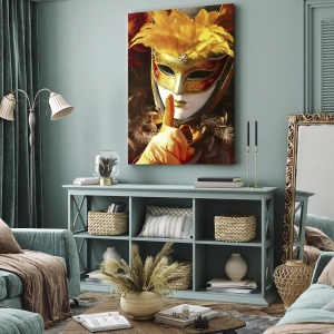 Obraz na płótnie - Maska karnawałowa w odcieniach złota i pomarańczu - 80x120cm - Tajemnica to część gry - Nowoczesna dekoracja ścienna do salonu i sypialni ARTTOR