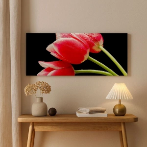 Obraz na płótnie - Czerwone tulipany z kroplami rosy na czarnym tle - 70x100cm - Obietnica czystej miłości - Nowoczesna dekoracja ścienna do salonu i sypialni ARTTOR