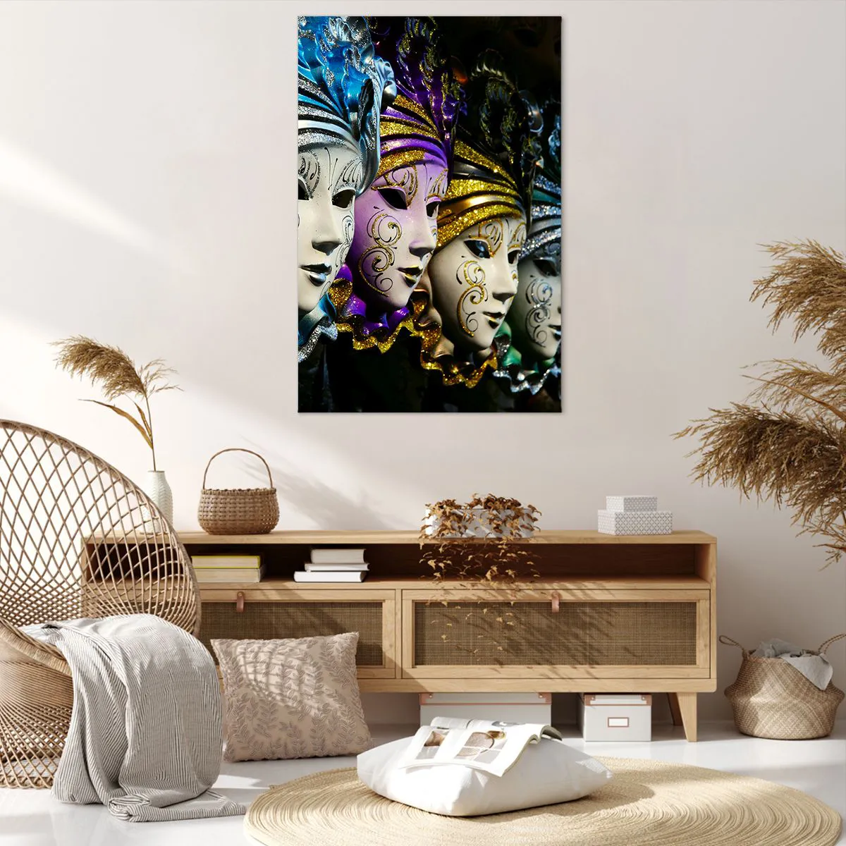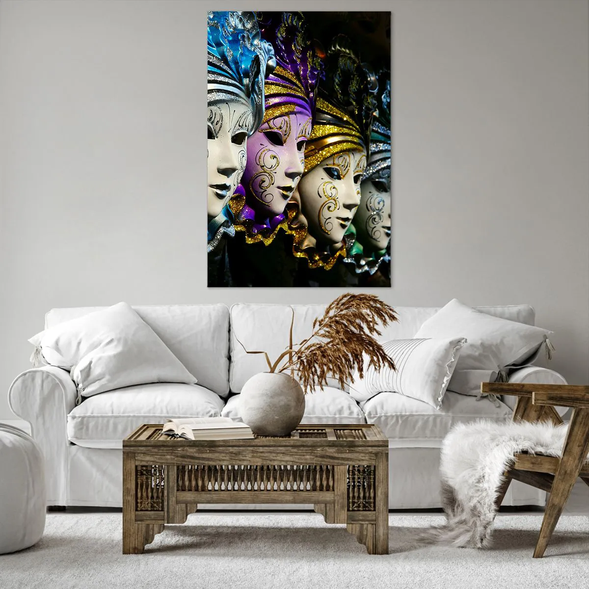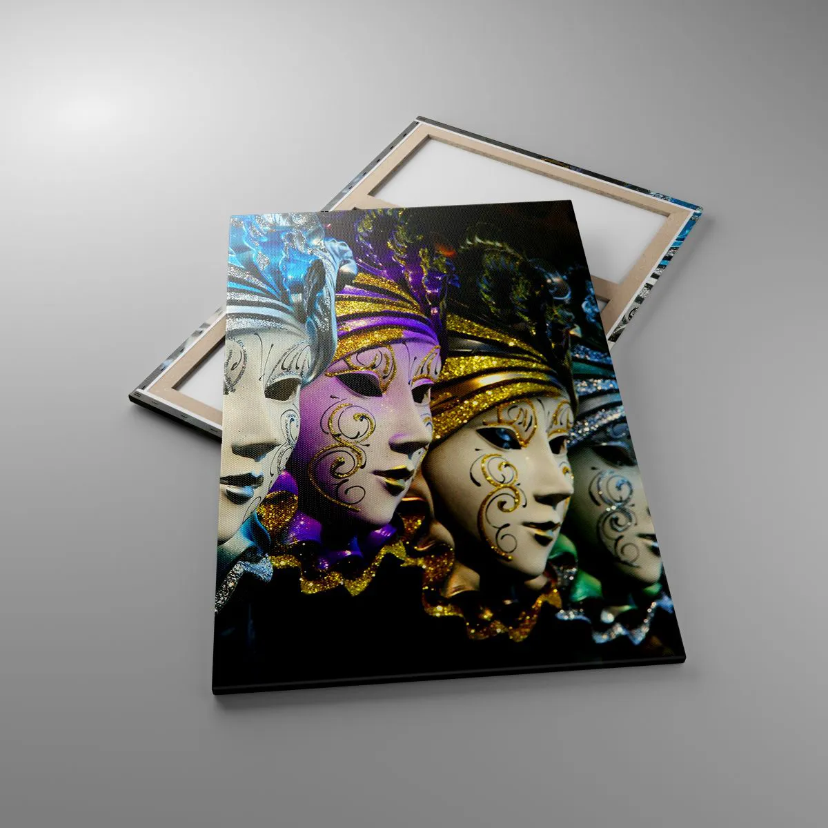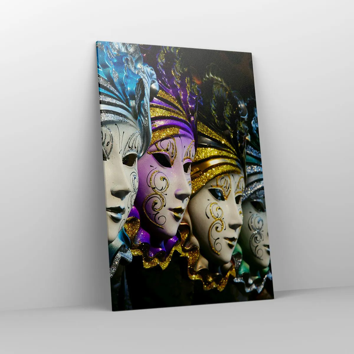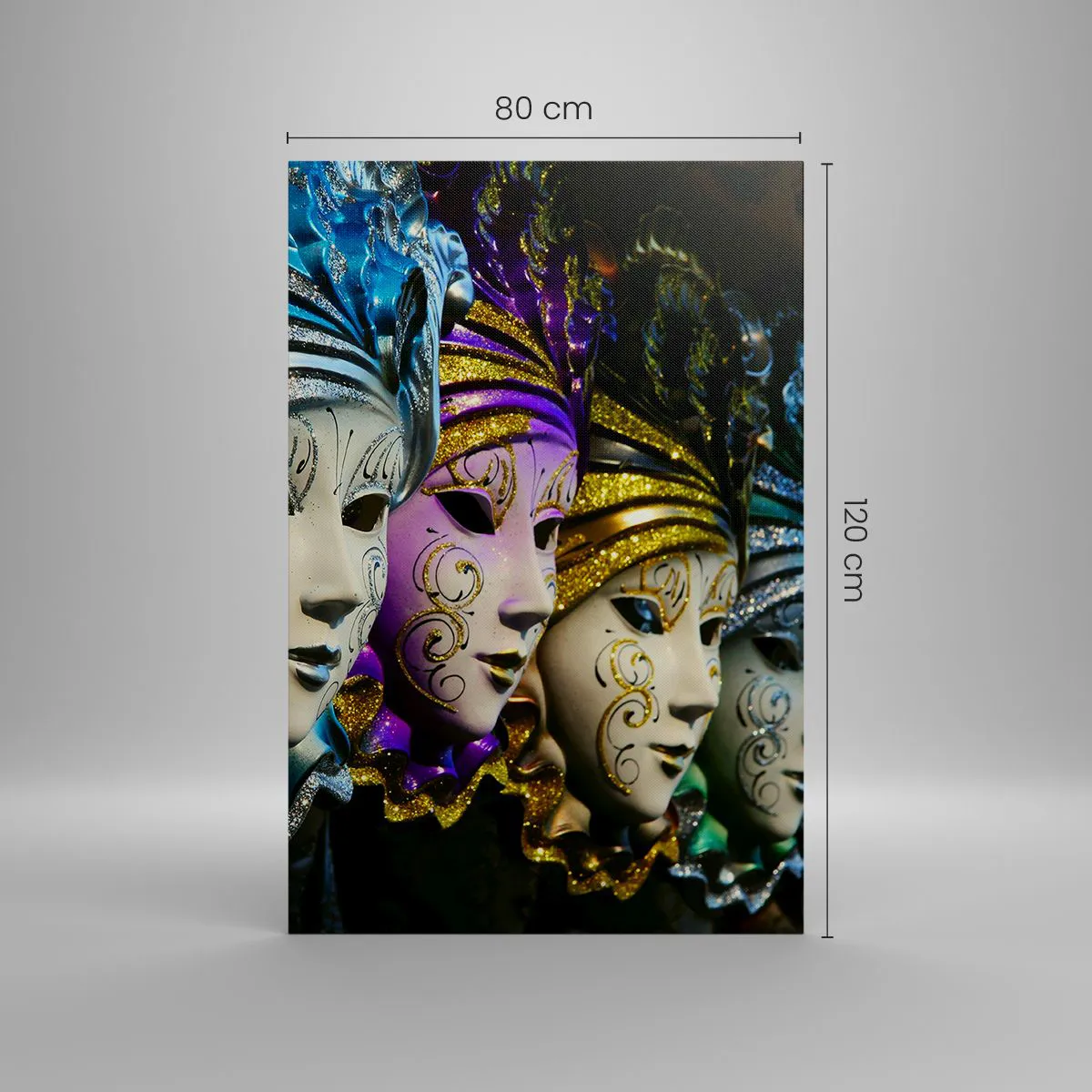 Obraz na płótnie - Maski weneckie w różnych kolorach z ozdobnymi wzorami - 80x120cm - Tajemnica w złocie i w srebrze - Nowoczesna dekoracja ścienna do salonu i sypialni ARTTOR