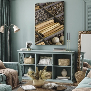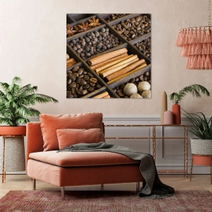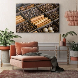 Obraz na płótnie - Przyprawy i kawa w drewnianych przegródkach - 70x100cm - Skarbiec aromatów - Nowoczesna dekoracja ścienna do salonu i sypialni ARTTOR