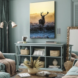 Obraz na płótnie - Jeleń na mroźnej polanie o wschodzie słońca - 80x120cm - Koronowany na swoich włościach - Nowoczesna dekoracja ścienna do salonu i sypialni ARTTOR