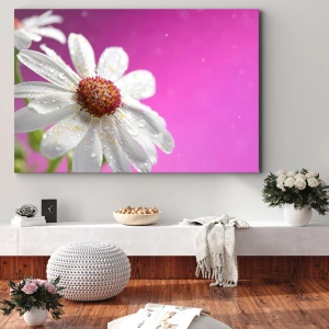Obraz na płótnie - Biała stokrotka pokryta kroplami wody na różowym tle - 70x100cm - Skromny w swojej urodzie - Nowoczesna dekoracja ścienna do salonu i sypialni ARTTOR
