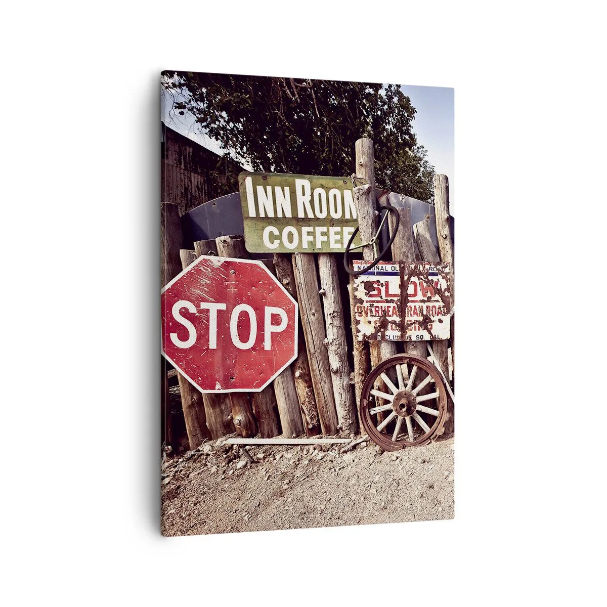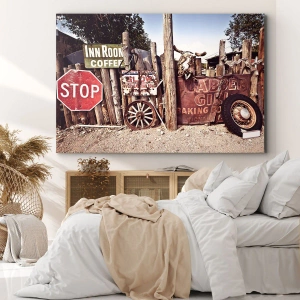 Obraz na płótnie - Drewniany płot z retro znakami drogowymi - 50x70cm - A czas się zatrzymał - Nowoczesna dekoracja ścienna do salonu, kuchni i sypialni ARTTOR