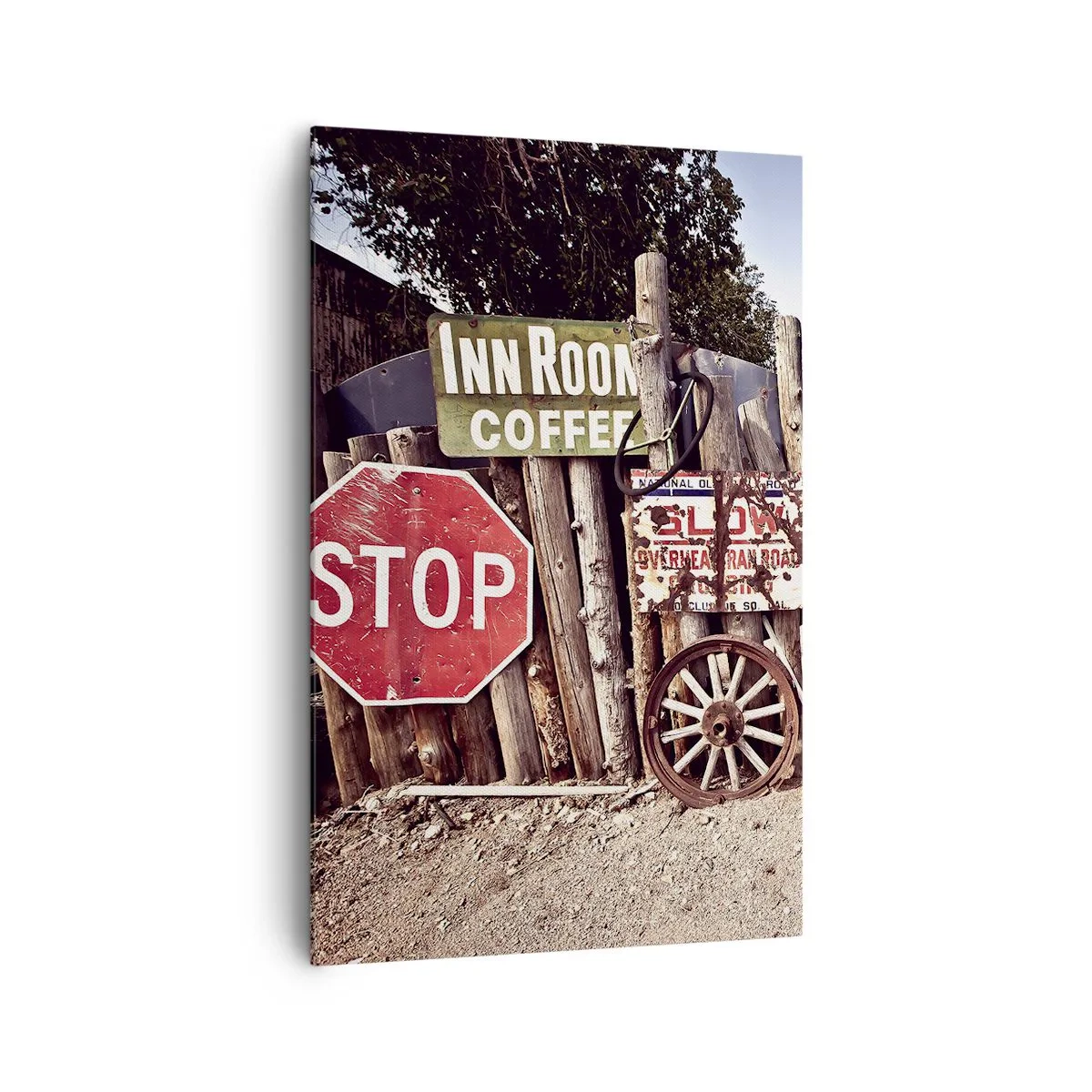 Obraz na płótnie - Rustykalne dekoracje z tablicami i kołem na ogrodzeniu - 80x120cm - A czas się zatrzymał - Nowoczesna dekoracja ścienna do salonu i sypialni ARTTOR