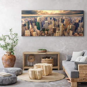 Obraz na płótnie - Panorama miasta z widokiem na drapacze chmur o zachodzie słońca - 70x100cm - Wyzłocone metropolis - Nowoczesna dekoracja ścienna do salonu i sypialni ARTTOR