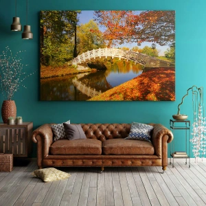 Obraz na płótnie - Biały mostek nad rzeką w jesiennym krajobrazie - 50x70cm - Na białym mostku westchnień - Nowoczesna dekoracja ścienna do salonu, kuchni i sypialni ARTTOR