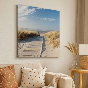 Obraz na płótnie - Drewniana ścieżka prowadząca na plażę - 50x70cm - Za wydmą, w szumie traw - Nowoczesna dekoracja ścienna do salonu, kuchni i sypialni ARTTOR