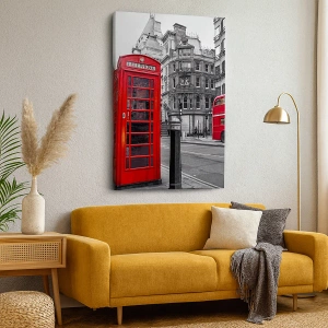 Obraz na płótnie - Czerwona budka telefoniczna na tle Londynu - 50x70cm - Najczerwieńsze w Europie - Nowoczesna dekoracja ścienna do salonu, kuchni i sypialni ARTTOR