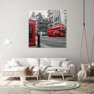 Obraz na płótnie - Czerwona budka telefoniczna i autobus piętrowy w Londynie na tle miasta - 70x100cm - Najczerwieńsze w Europie - Nowoczesna dekoracja ścienna do salonu i sypialni ARTTOR