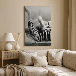 Obraz na płótnie - Czarno-biała zebra tarzająca się w kurzu - 50x70cm - Nie tylko koń by się uśmiał - Nowoczesna dekoracja ścienna do salonu, kuchni i sypialni ARTTOR