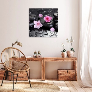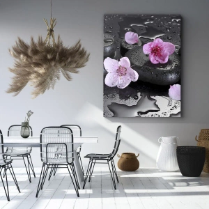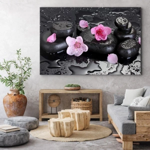 Obraz na płótnie - Czarne kamienie i różowe kwiaty w stylu spa - 80x120cm - I kamień spada z serca - Nowoczesna dekoracja ścienna do salonu i sypialni ARTTOR