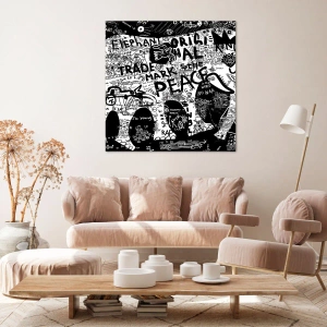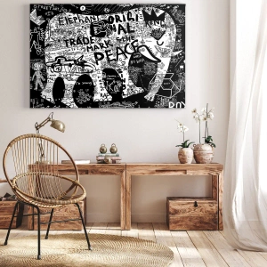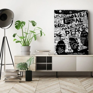 Obraz na płótnie - Czarno-biała grafika graffiti z hasłami i symbolami - 50x70cm - Bogaty świat ulicy - Nowoczesna dekoracja ścienna do salonu, kuchni i sypialni ARTTOR